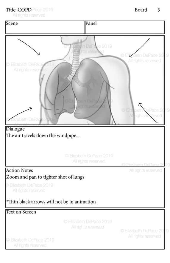 This storyboard is intended to be used by an animator to make a 3D animation describing Chronic Obstructive Pulmonary Disorder for a patient population. I received a script and a few action notes to work with. In addition to a full tone illustration with selective color, each of the twenty-two boards includes the dialogue, action notes, and text that will appear on the screen. One of the more challenging parts of creating this storyboard was figuring out how to explain the phenomenon of air trapping to a lay audience. My solution was to show a callout of an alveolus next to a human figure in order to relate the action taking place at the microscopic scale to the more relatable scale of the figure. (see boards 20, 21, and 22)